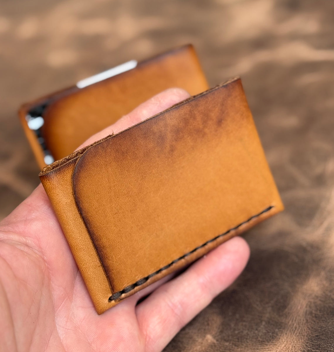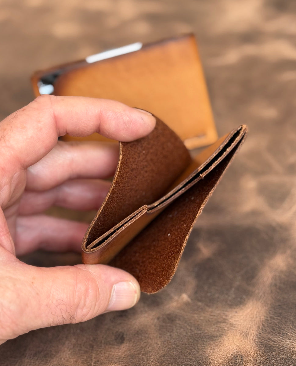 Stitched with brown Ritza Tiger thread, this wallet is subtle yet distinct—built for those who prefer to carry light without compromising on character or craftsmanship. Though chrome-tanned, this leather behaves like a veg-tan in feel and finish, softening with time and developing a rich patina with daily use.