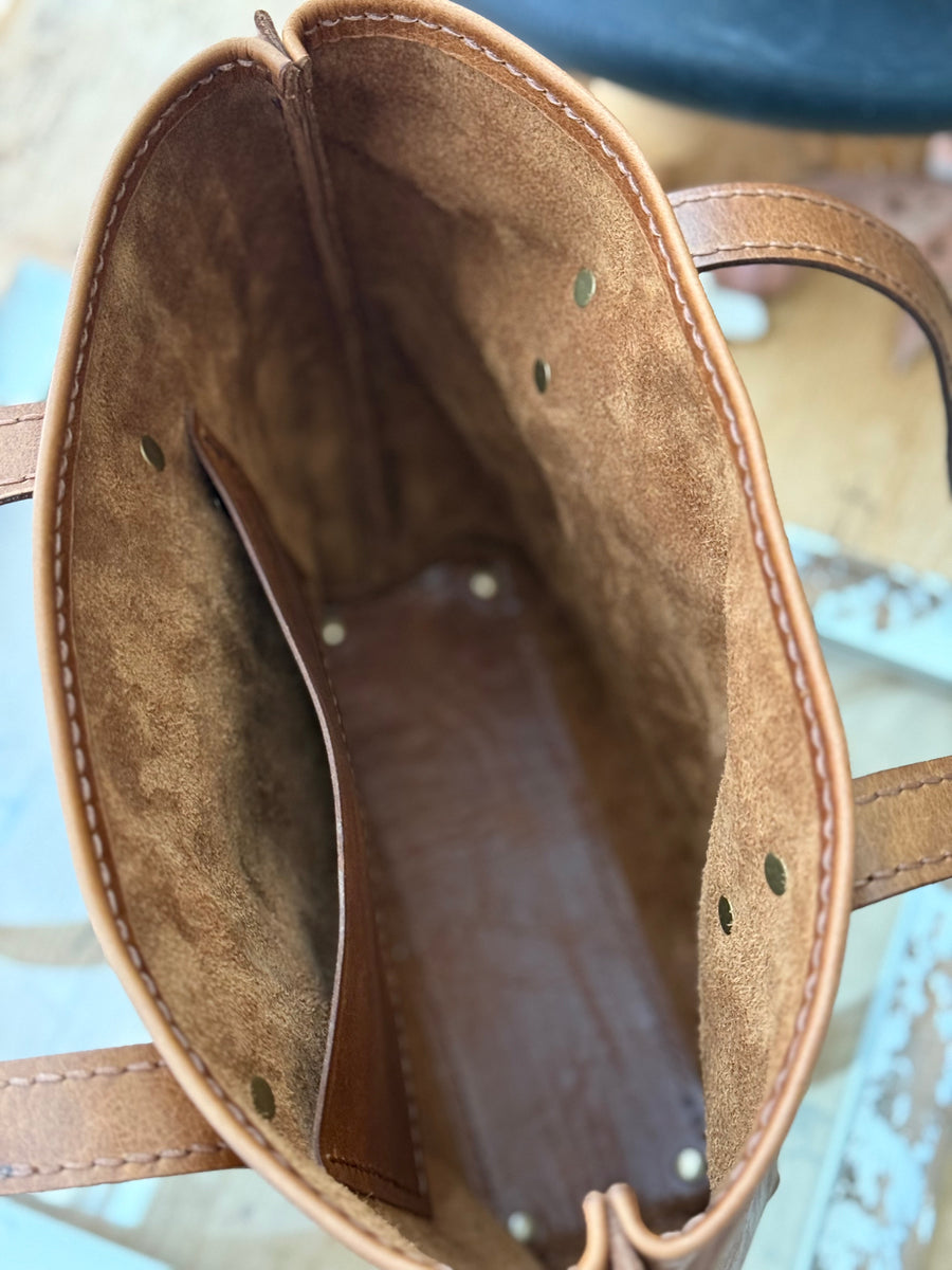 Designed without lining to keep it lightweight and minimal, this tote includes a structured leather base and interior slip pocket for added functionality. Subtle piping along the sides adds form, while solid brass rivets reinforce the handles without overwhelming the natural beauty of the material.